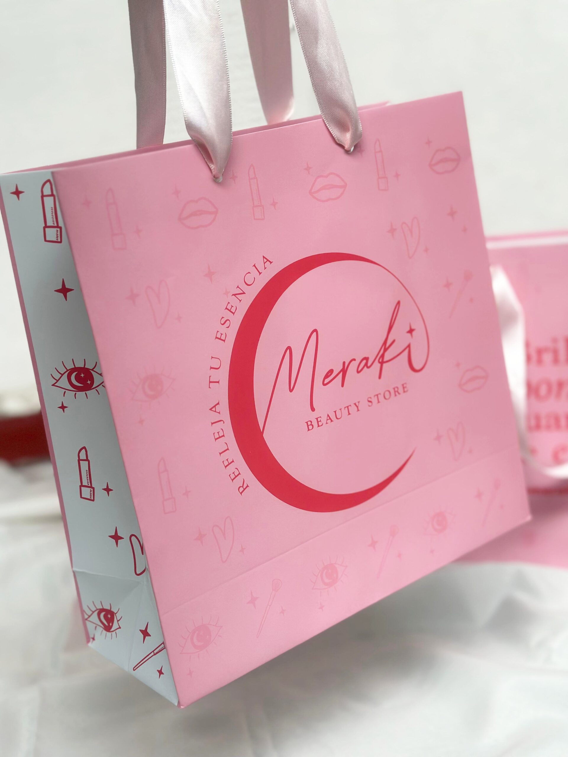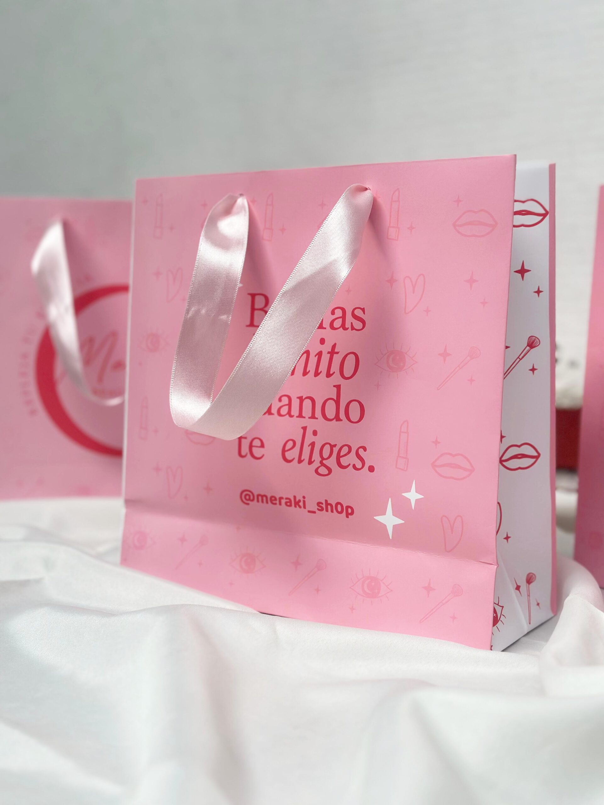 Troquelado minimalista, manija de papel resistente o cintas de satín llenas de elegancia. Tu eliges cómo te llevarán tus clientes.